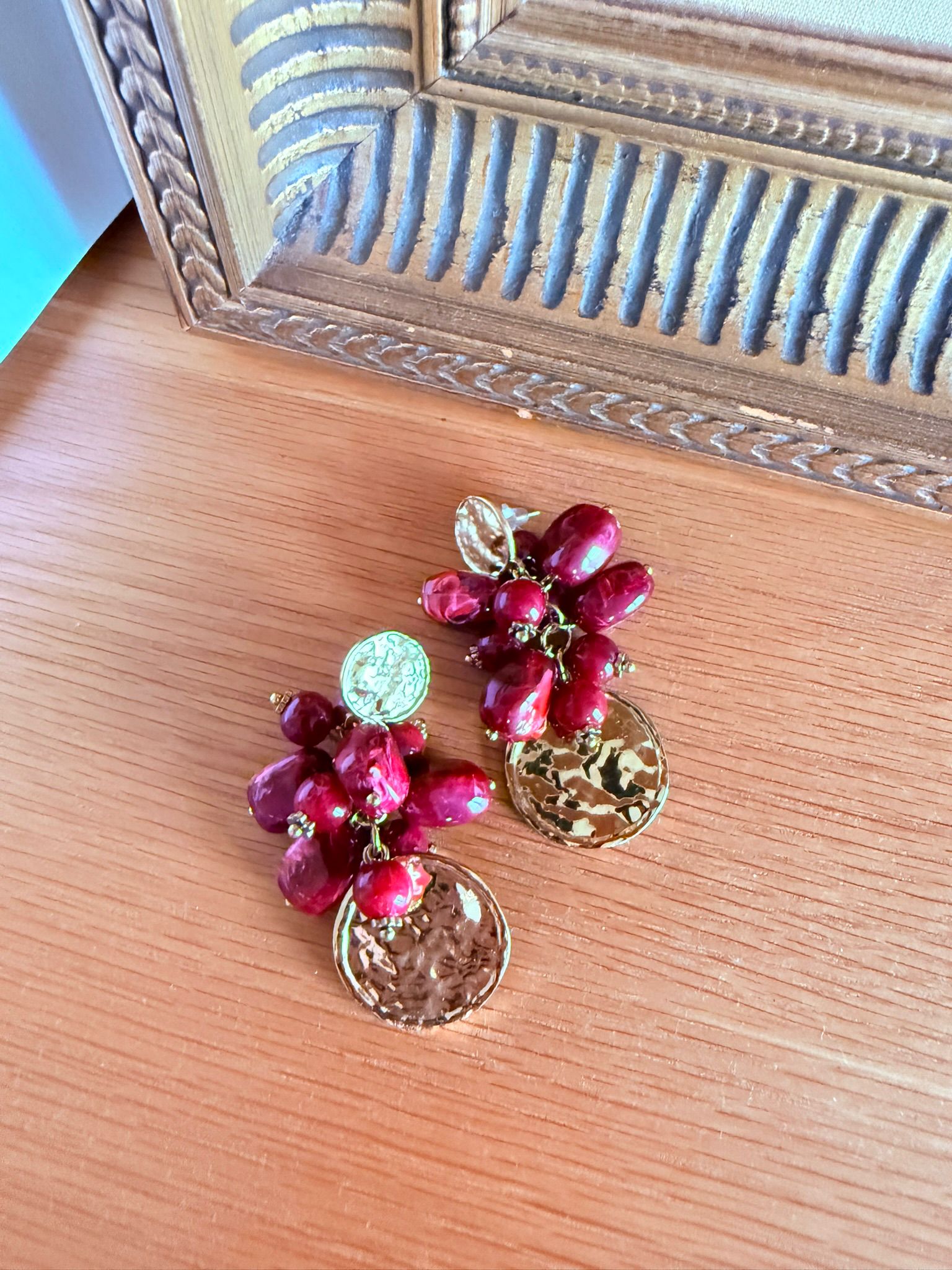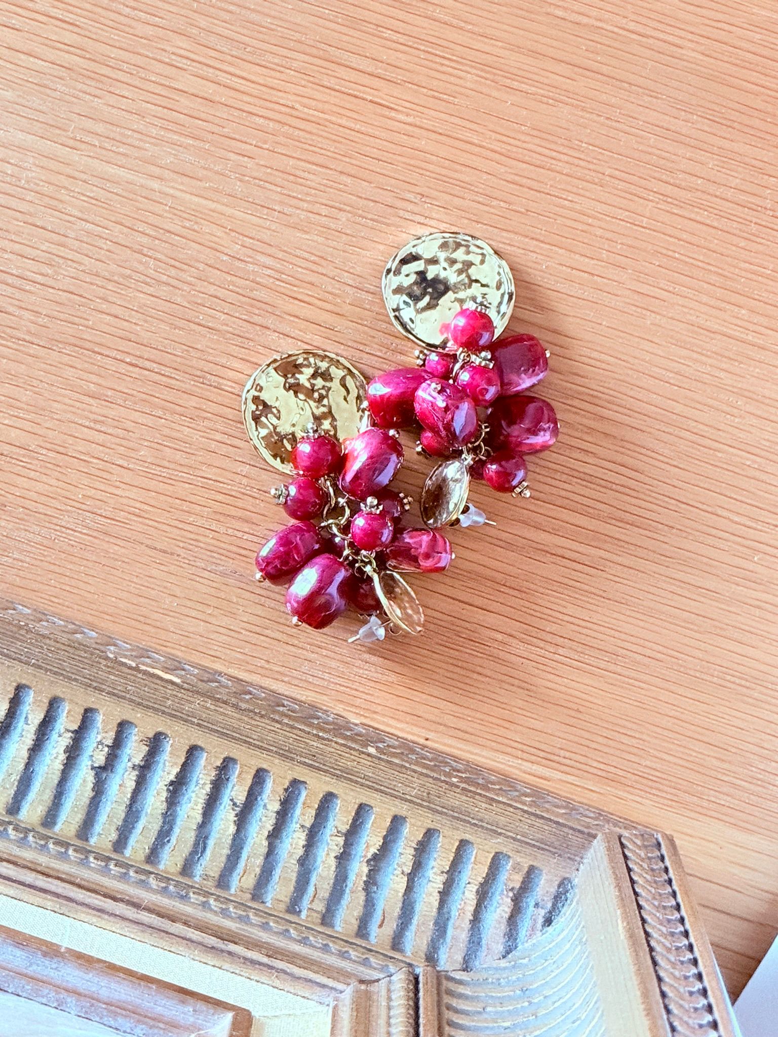 Fermoir pastille martelée, perles rouges en bouquet, pampille ronde martelée.